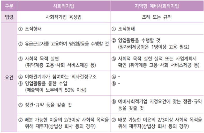 오늘은 사회적기업 중 예비사회적기업에 대해서 그 요건과 인증절차에 대해서 살펴보도록 하겠습니다. 사회적기업은 '인증사회적기업'과 '예비사회적기업'으로 구분해 볼 수 있으며, '예비사회적기업'은 인증사회적기업의 요건을 갖추지 못했으나 사회적기업의 실체를 가진 기업으로 지역형 예비사회적기업과 부처형 예비사회적기업으로 다시 구분 됩니다. 여기서 지역형과 부처형의 구분기준은 근거규정과 지정주체가 다르다고 이해하시면 될 것 같습니다.